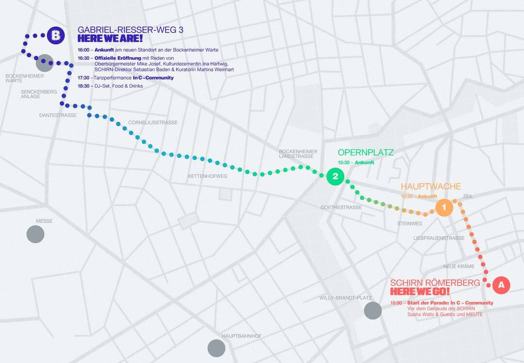 The festive opening of the Schirn in Bockenheim will begin at 4:30 p.m. with speeches by Mayor Mike Josef, Head of the Department of Culture Ina Hartwig, Schirn Director Sebastian Baden and Martina Weinhart, curator of the project »Sasha Waltz & Guests. In C – Community.«