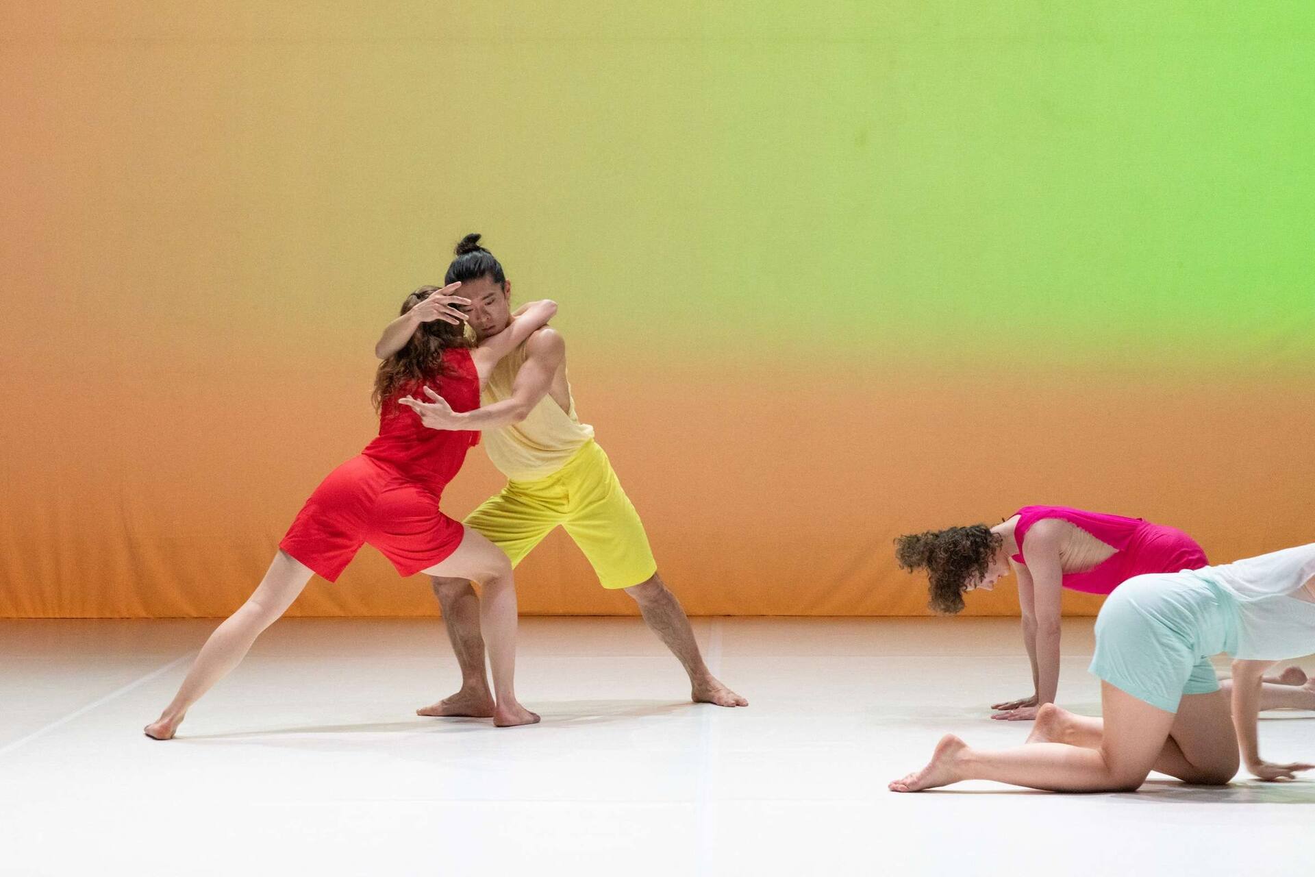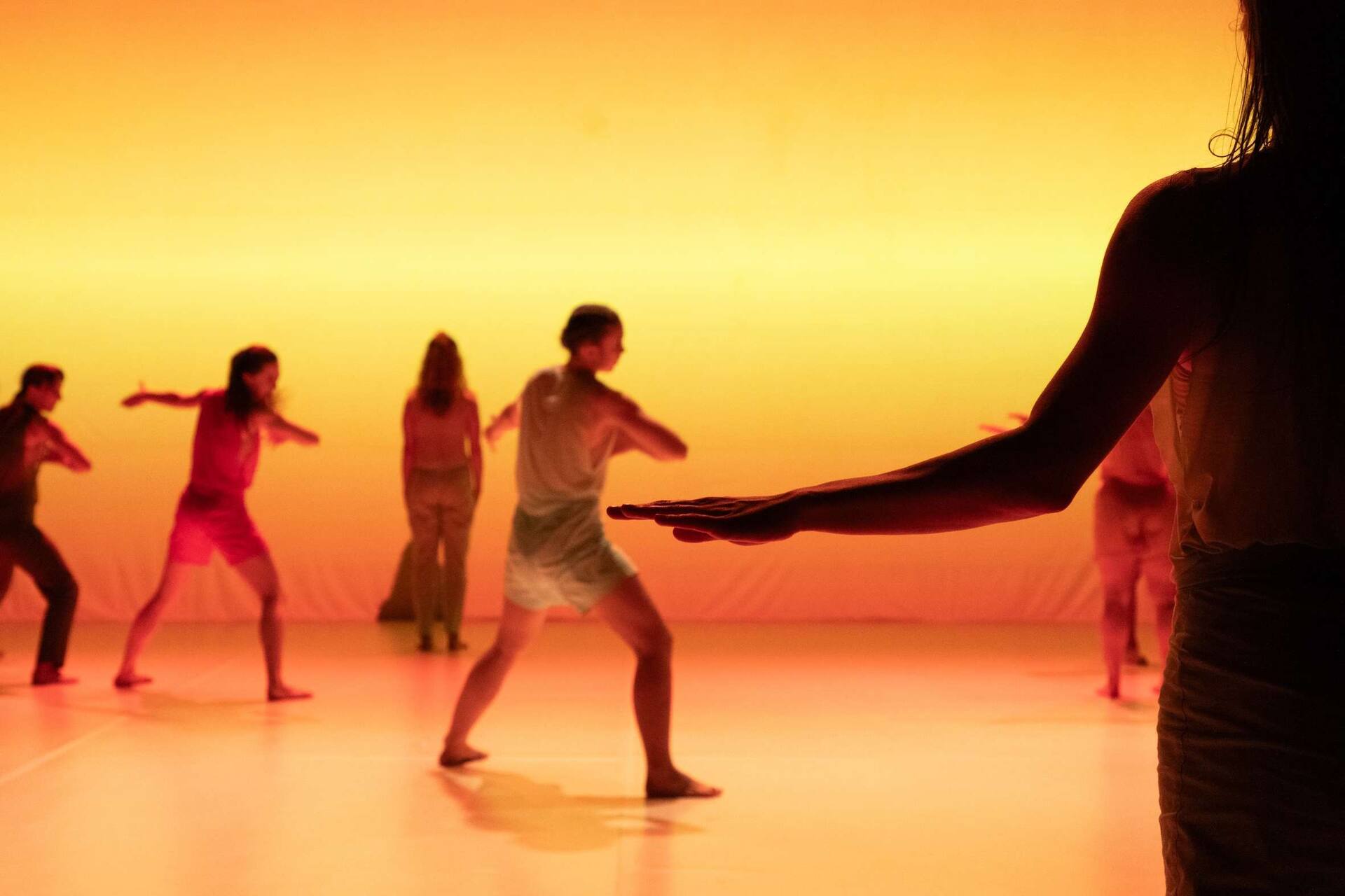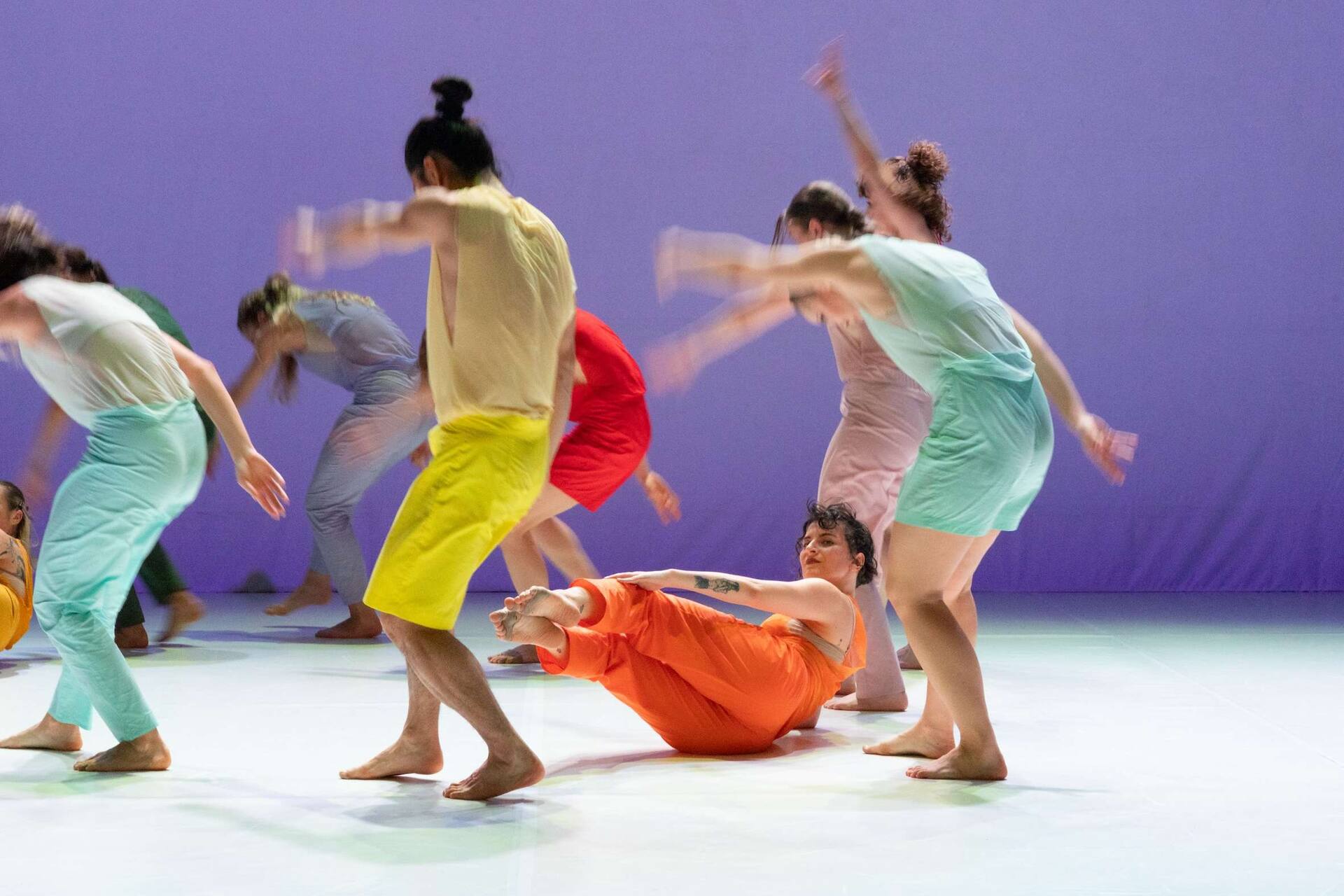 choreographic material digitally and independently of their location. The play has no stage design, light and costumes can be adapted and
