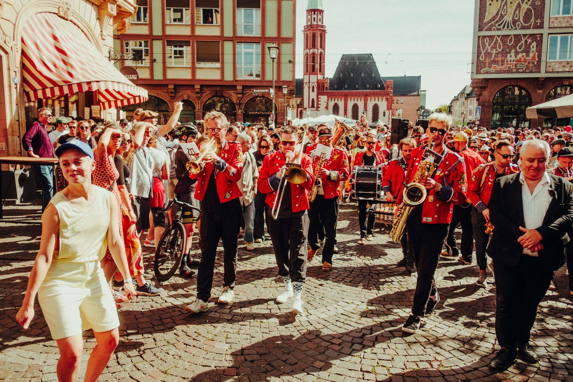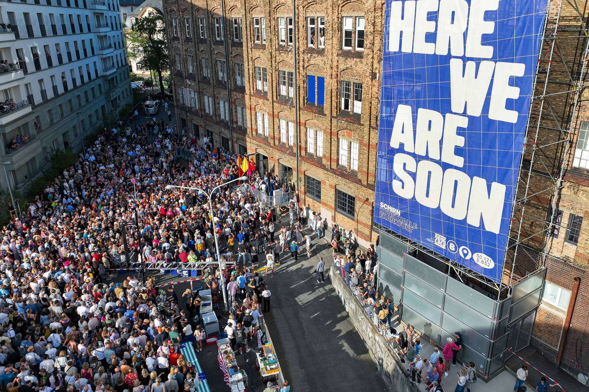 The parade, featuring professional dancers from Sasha Waltz & Guests and amateur groups from Frankfurt, started at 3 p.m. at the SCHIRN am Römer and led to the temporary venue, the former Dondorf printing plant, which had been refurbished for use as an art gallery. The reason for the move is the energy-efficient renovation of the main building at the Römer.