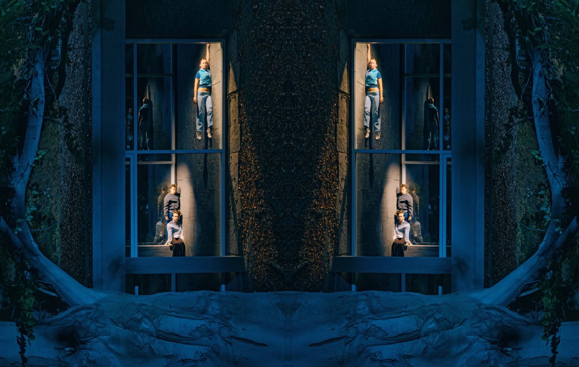 The result is a live performance, with the young dancers taking to a stage that extends into these transformed spaces, entering a play between the different levels of reality – all set to a soundscape of amplified movements, sub-frequencies that make bodies and buildings tremble, snippets of archived electronic music composed on-site, cinematic genre-textures, and the dancers’ own favourite sounds.